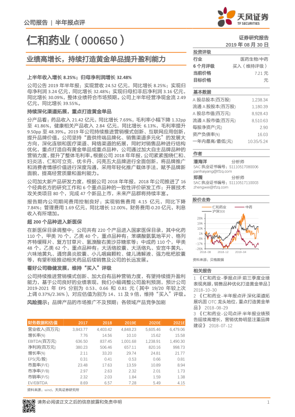 仁和药业2019年上半年业绩表现出色,营收和净利润均实现显著增长。公司通过持续深化渠道拓展,重点打造黄金单品,加大新产品研发力度,并有效控制期间费用,提升了整体盈利能力。在新医保目录调整中,公司众多产品进入目录,有望推动未来销售增长。天风证券看好公司稳健发展,维持“买入”评级,并小幅上调了盈利预测。投资者应关注品牌产品的市场推广情况以及各领域产品竞争加剧的风险。