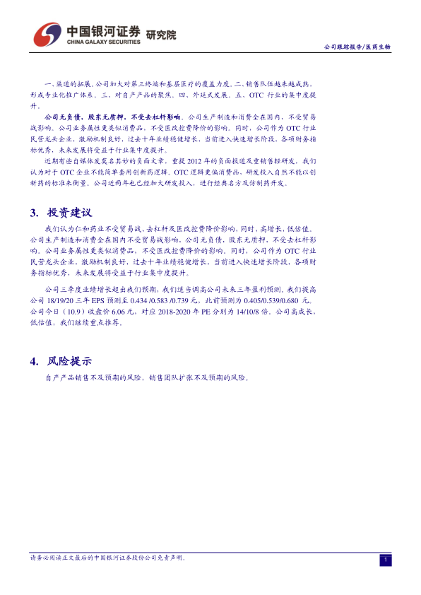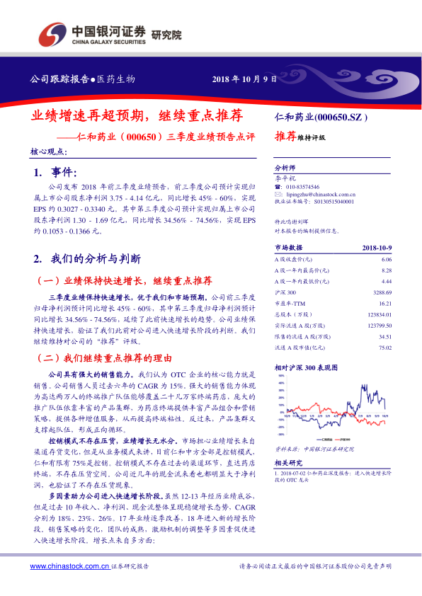 本报告分析了仁和药业2018年前三季度的业绩预告,指出公司业绩增长超出预期,验证了此前对公司进入快速增长阶段的判断。报告深入分析了公司业绩增长的原因,包括强大的销售能力、控销模式、渠道拓展、团队成熟等,并强调公司不受贸易战、去杠杆及医改控费降价等外部因素的影响。基于以上分析,报告调高了公司未来三年的盈利预测,维持“推荐”评级,并提示了自产产品销售和销售团队扩张不及预期的风险。总体而言,本报告对仁和药业的投资价值给予了积极评价。