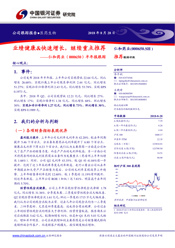 本报告分析了仁和药业(000650.SH)2018年半年报,并对其未来发展潜力进行了评估。核心观点如下: