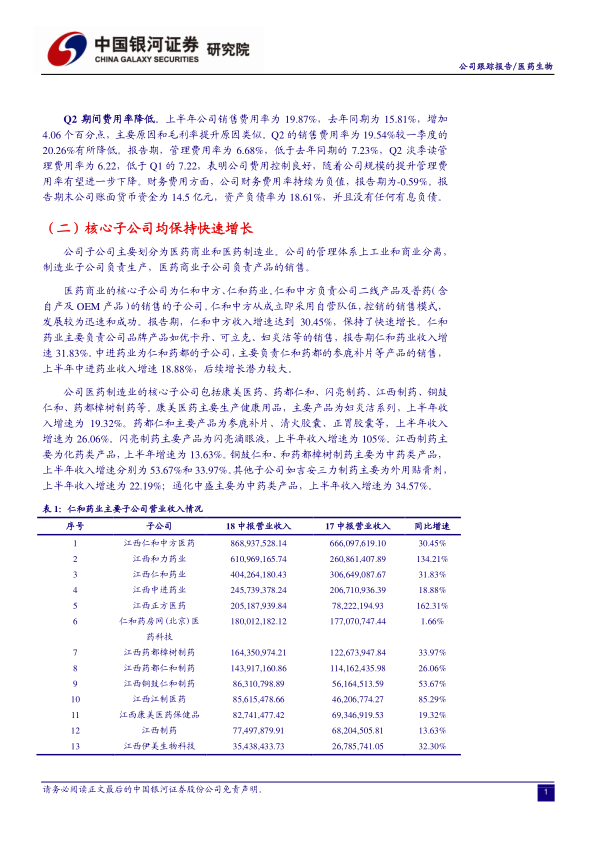 基于公司良好的激励机制、丰富的产品系列和强大的销售能力,以及不受贸易战和医改政策影响的优势,维持对仁和药业的重点推荐评级。