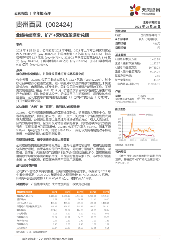 基于公司2023年中报的业绩表现以及扩产和营销改革的持续推进,分析师维持了对贵州百灵的“买入”评级。预计公司业绩将保持稳健增长,2023年至2025年的营业收入预测分别为44.75亿元、54.34亿元和64.75亿元,归母净利润预测分别为3.11亿元、4.60亿元和6.92亿元。这些预测反映了市场对公司未来增长潜力的积极预期。