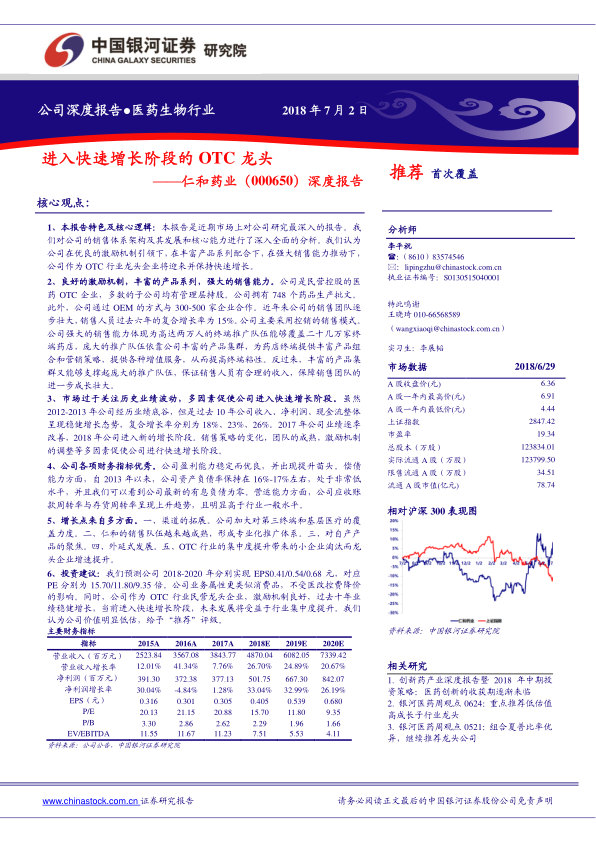 仁和药业的核心增长逻辑在于其良好的激励机制、丰富的产品系列和强大的销售能力三者形成的良性循环。公司作为民营控股的OTC行业龙头,通过管理层持股激发活力,以748个药品生产批文和300-500家OEM合作企业构建了多元化的产品矩阵。其高达两万人的终端推广队伍覆盖二十余万家药店,并提供增值服务,形成了强大的市场渗透力。尽管历史业绩曾有波动,但公司长期保持稳健增长,并在2017年业绩逐季改善后,于2018年进入新的快速增长阶段。财务指标显示公司盈利能力稳定且有提升趋势,偿债能力强劲,营运能力健康。未来,公司将受益于渠道拓展、销售团队成熟、聚焦自产产品、外延式发展以及OTC行业集中度提升等多重因素。报告预测公司未来三年业绩将持续高增长,当前估值被明显低估,首次覆盖给予“推荐”评级。