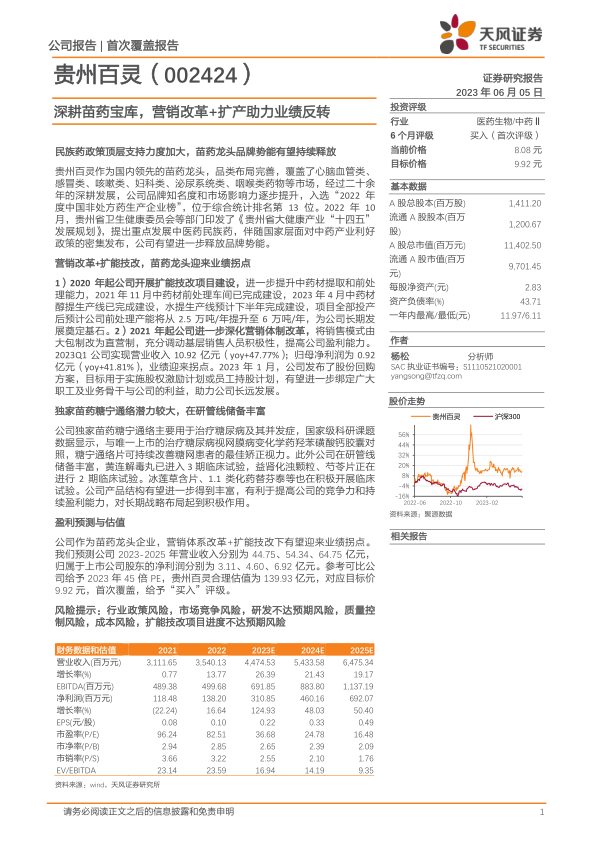 公司作为苗药龙头企业,营销体系改革+扩能技改下有望迎来业绩拐点。我们预测公司 2023-2025 年营业收入分别为 44.75、 54.34、 64.75 亿元,归属于上市公司股东的净利润分别为 3.11、 4.60、 6.92 亿元。参考可比公司给予 2023 年 45 倍 PE,贵州百灵合理估值为 139.93 亿元,对应目标价9.92 元,首次覆盖,给予“买入”评级。