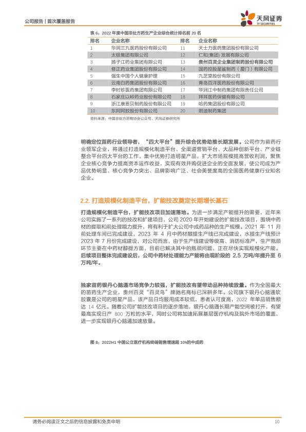 贵州百灵作为国内领先的苗药龙头, 品类布局完善, 覆盖了心脑血管类、感冒类、 咳嗽类、 妇科类、泌尿系统类、咽喉类药物等市场, 经过二十余年的深耕发展, 公司品牌知名度和市场影响力逐步提升, 入选“2022 年度中国非处方药生产企业榜”,位于综合统计排名第 13 位。 2022 年 10月,贵州省卫生健康委员会等部门印发了《贵州省大健康产业“十四五”发展规划》,提出重点发展中医药民族药, 伴随国家层面对中药产业利好政策的密集发布, 公司有望进一步释放品牌势能。