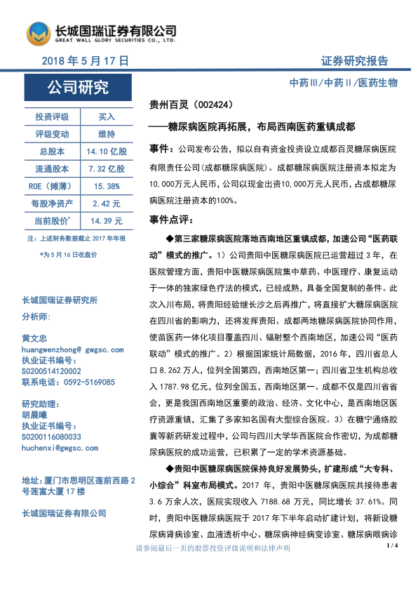 贵州百灵计划在成都设立糖尿病医院,是公司“医药联动”模式的重要一步,有望扩大在西南地区的影响力。贵阳中医糖尿病医院的成功经验为成都医院的运营奠定了基础。维持公司“买入”评级,但需关注产品价格、市场推广及研发风险。