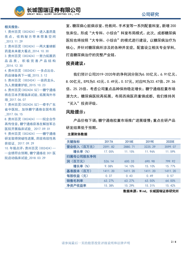 公司重点品种保持稳定增长,糖宁通络胶囊市场潜力巨大,且将在日本开展临床试验,拓展海外市场。因此,维持贵州百灵“买入”投资评级。