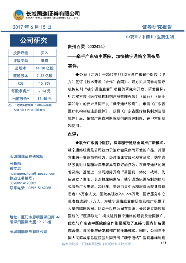 本报告分析了贵州百灵与广东省中医院合作开发“糖宁通络胶囊”的事件,认为此举将加速糖宁通络的全国推广,并可能带来新的利润增长点。报告维持了对贵州百灵的“买入”投资评级,并基于公司稳健的业绩增长和良好的发展前景给出了盈利预测。同时,报告也提示了相关风险,为投资者提供了全面的参考信息。