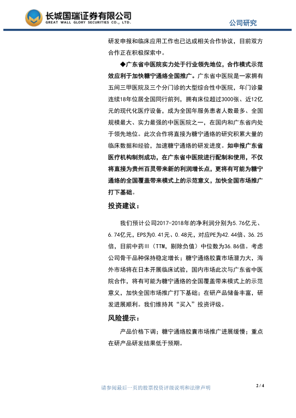 预计公司2017-2018年的净利润分别为5.76亿元、6.74亿元,EPS为0.41元、0.48元,对应PE为42.44倍、36.25倍。维持“买入”投资评级,理由包括:骨干品种保持稳定增长;糖宁通络胶囊市场潜力大,与广东省中医院合作有望加快全国市场推广;在研产品储备丰富,研发进展顺利。