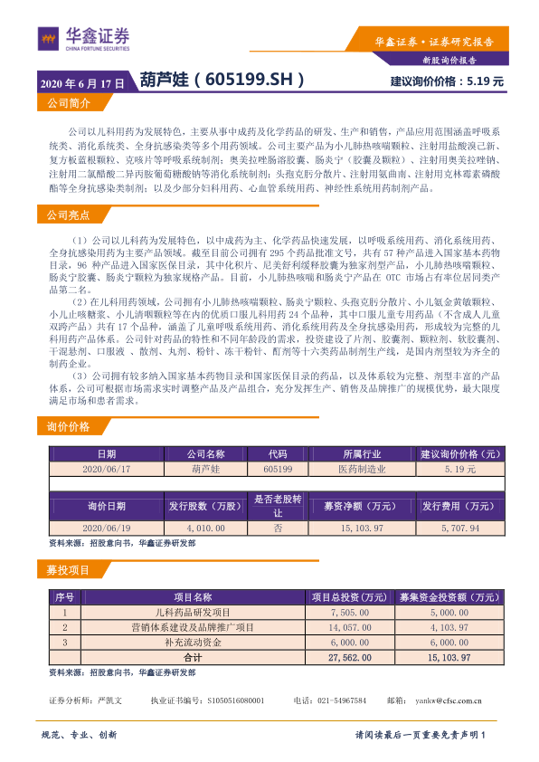 本报告对葫芦娃(605199.SH)进行了新股询价分析,公司以儿科用药为特色,拥有丰富的产品线和较强的市场竞争力。建议询价价格为5.19元,投资者可关注其在儿科用药领域的优势和未来的发展潜力。