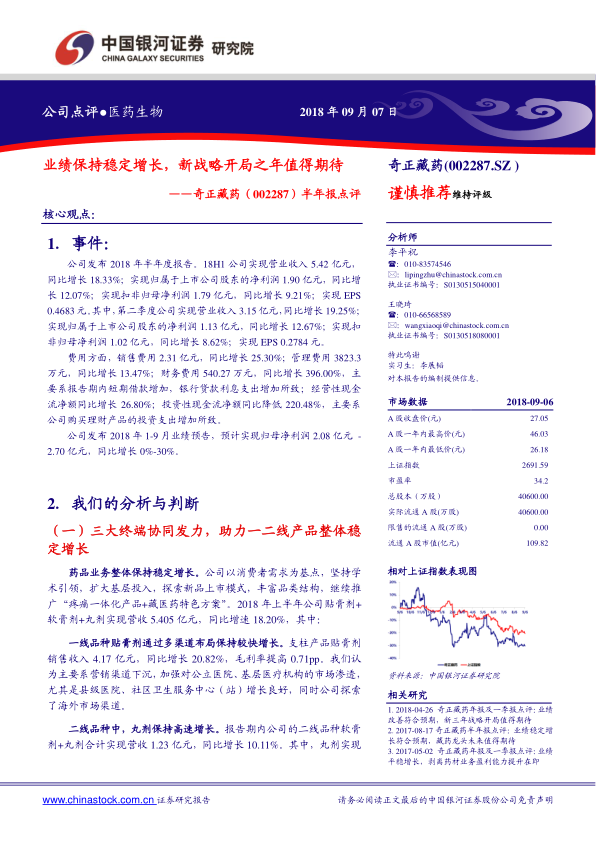 奇正藏药在2018年上半年展现了稳健的财务表现,营业收入和净利润均实现双位数增长,尤其在第二季度保持了强劲的增长势头。公司通过在医院、基层和零售三大终端的协同发力,有效推动了核心产品贴膏剂和二线品种丸剂的销售增长。同时,公司积极推进“一轴两翼三支撑”的新战略,旨在强化品牌、产品、营销、研发和资源等核心竞争力,通过丰富产品线、创新营销模式和加大研发投入,为未来的可持续发展奠定基础。尽管存在药品降价和新品推广不及预期的风险,但基于其清晰的战略规划和良好的业绩预期,分析师维持“谨慎推荐”的投资评级,预计公司未来几年将保持稳定的盈利增长。