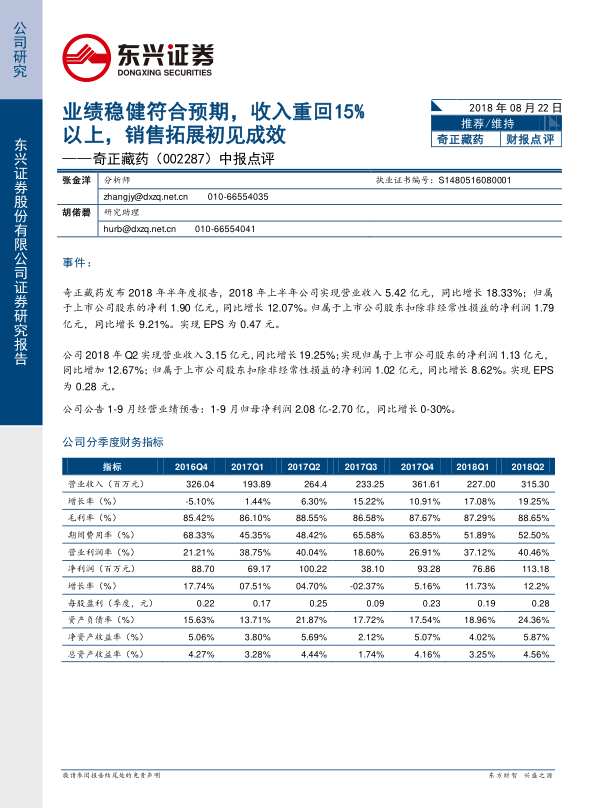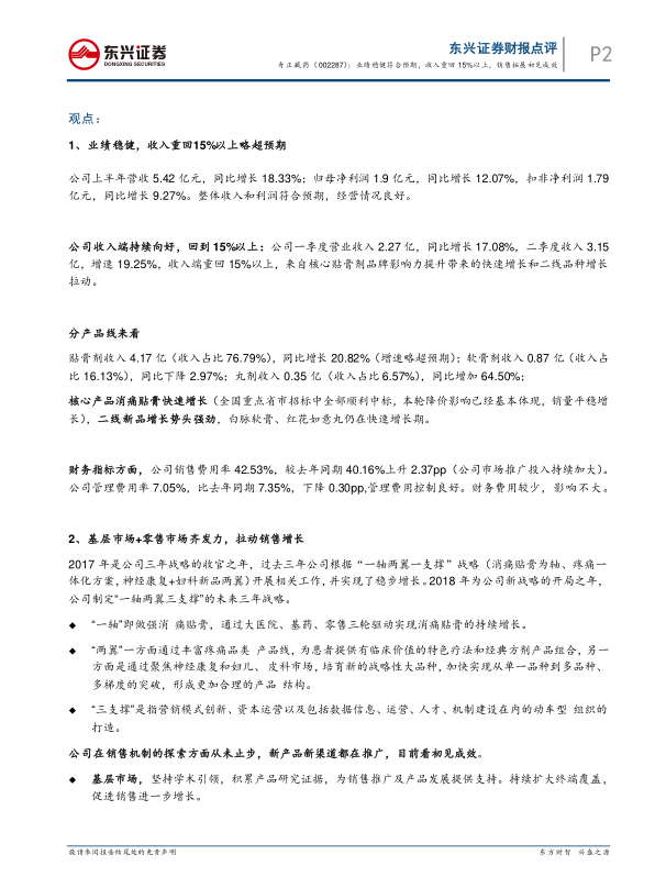 本报告分析了奇正藏药2018年半年度报告,指出公司业绩稳健,收入重回15%以上,略超预期。这主要得益于核心产品消痛贴膏的品牌影响力提升和二线品种的快速增长。同时,公司在基层市场和零售市场齐发力,通过学术引领、扩大终端覆盖、品牌建设和新品推广等方式,有效拉动了销售增长。
