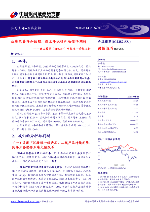 本报告对奇正藏药(002287.SZ)的2017年年报及2018年一季报进行了分析,并展望了公司未来发展前景。核心观点如下: