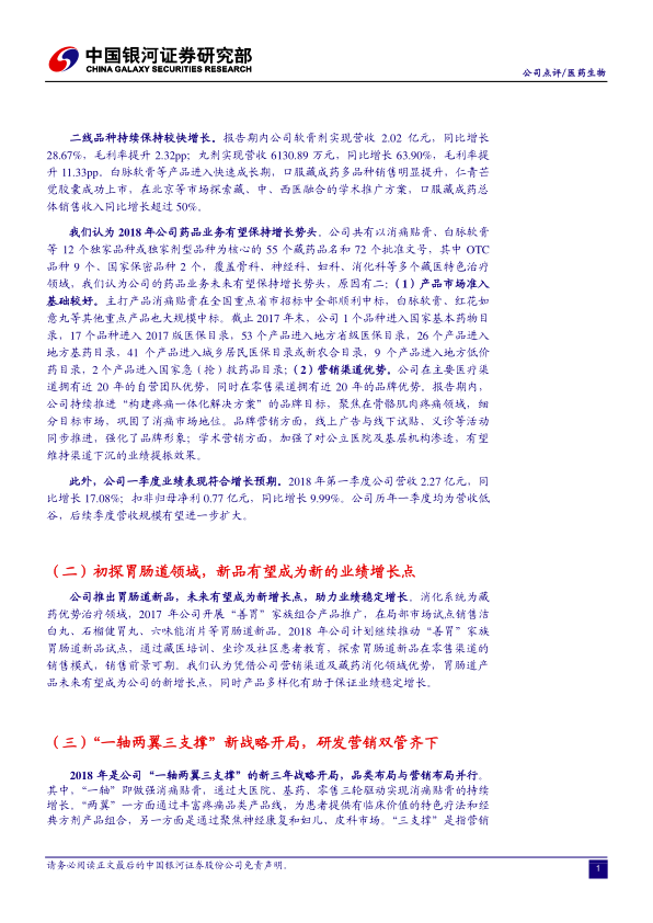 奇正藏药2017年业绩符合预期,药品业务整体业绩大幅改善,一线产品通过渠道下沉恢复增长,二线产品保持快速发展。公司“一轴两翼三支撑”新三年战略开局,品类布局与营销布局并行,研发进展顺利。预计公司未来三年净利润稳步增长,维持“谨慎推荐”评级。但需关注药品降价风险和新品市场推广进度。
