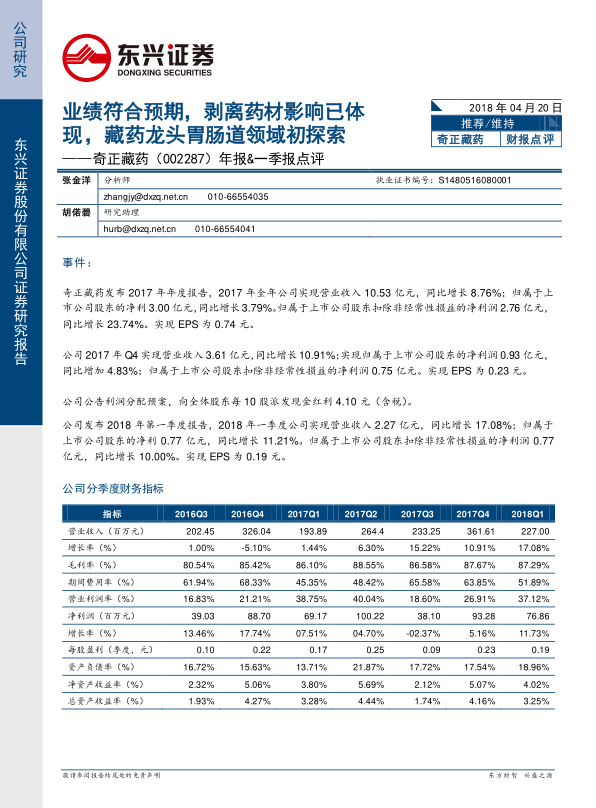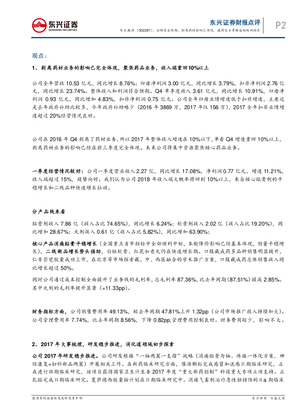 本报告的核心观点是:奇正藏药2017年业绩符合预期,剥离药材业务的影响已经完全体现,公司聚焦药品业务后,收入端重回10%以上增长。同时,公司在藏药龙头地位稳固的基础上,积极探索胃肠道领域,并受益于政策支持,未来发展值得期待。