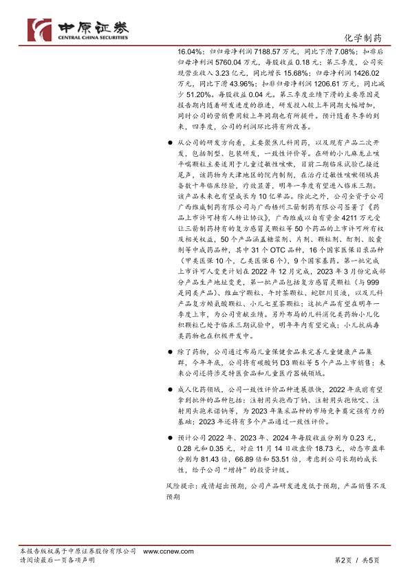 从公司的研发方向看,主要聚焦儿科用药,以及现有产品二次开发,包括剂型、包装研发,一致性评价等。在研的小儿麻龙止咳平喘颗粒主要适用于儿童过敏性咳嗽,目前二期临床试验已接近尾声,该药物为天津地区的院内制剂,在治疗过敏性咳嗽领域具备数十年临床经验,疗效显著,明年一季度有望进入临床三期。该产品未来也有望成长为10亿单品。除此之外,公司全资子公司广西维威制药有限公司与广西梧州三箭制药有限公司签署了《药品上市许可持有人转让协议》,广西维威以自有资金4211万元受让三箭制药持有的复方感冒灵颗粒等50个药品的上市许可所有权及相关权益,50个产品涵盖糖浆剂、片剂、颗粒剂、酊剂、胶囊剂等中成药品种,其中31个OTC品种,16个国家医保目录品种(甲类医保10个,乙类医保6个),9个国家基药。第一批完成上市许可人变更计划在2022年12月完成,2023年3月份完成部分产品生产地址变更,第一批产品包括复方感冒灵颗粒(与999是同类产品)、维血宁颗粒、午时茶颗粒、蛇胆川贝液,以及儿科产品复方赖氨酸颗粒、小儿七星茶颗粒;这批产品有望在明年一季度上市,为公司贡献业绩。另外布局的儿科消化类药物小儿化积颗粒已处于临床三期试验中,明年年内有望完成;小儿抗病毒类药物也在积极开发中。