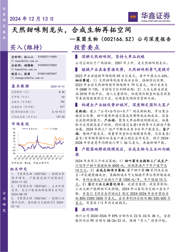 公司深度报告:天然甜味剂龙头,合成生物再拓空间