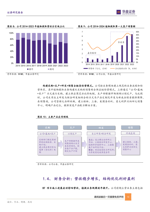 公司主营业务已完全聚焦于植物提取物,主要品类包括天然甜味剂(甜叶菊及罗汉果提取物)、工业大麻提取物(大麻二酚CBD)、茶叶提取物(茶多酚、茶氨酸等)以及其他提取物(槐花、虎杖、红景天等)。2023年,植提业务实现营收14.84亿元。公司构建了从采购、生产、研发到销售的全链条经营模式,上游通过“公司+基地+农户”模式保障原料供应,中游通过自建+并购(如控股华高生物布局茶叶提取)推进产能拓展,下游通过四大营销中心(桂林、上海、美国洛杉矶、意大利萨沃纳)辐射全球市场,并提供深度产品配方解决方案。