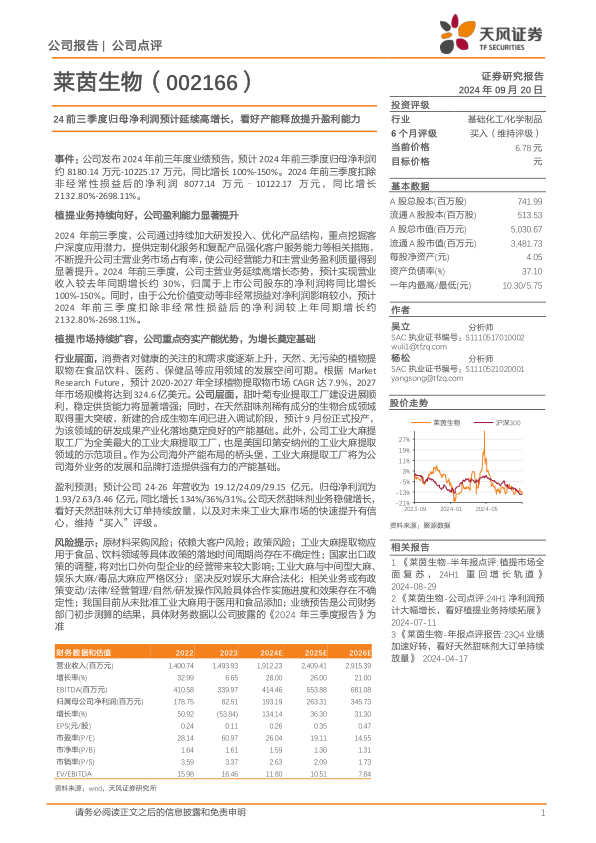 莱茵生物受益于植提业务的持续向好和市场扩容,盈利能力显著提升,预计前三季度业绩高增长。公司通过夯实产能优势,为未来的增长奠定基础。维持“买入”评级,但需关注原材料采购、政策变动等风险。