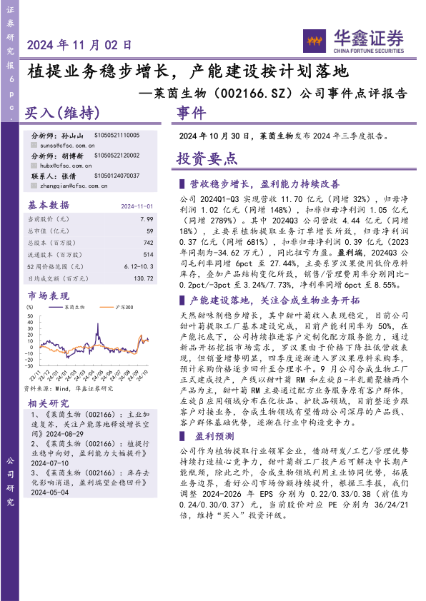 公司作为植物提取行业领军企业,借助研发/工艺/管理优势持续打造核心竞争力,甜叶菊新工厂投产后可解决中长期产能瓶颈,除此之外,合成生物领域利用主业协同优势,拓展业务边界,看好公司市场份额持续提升,根据三季报,我们调整2024-2026年EPS分别为0.22/0.33/0.38(前值为0.24/0.30/0.37)元,当前股价对应PE分别为36/24/21倍,维持“买入”投资评级。