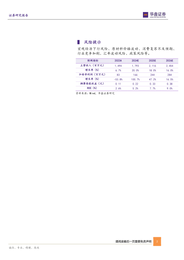 宏观经济下行风险、原材料价格波动、消费复苏不及预期、行业竞争加剧、汇率波动风险、政策风险等。