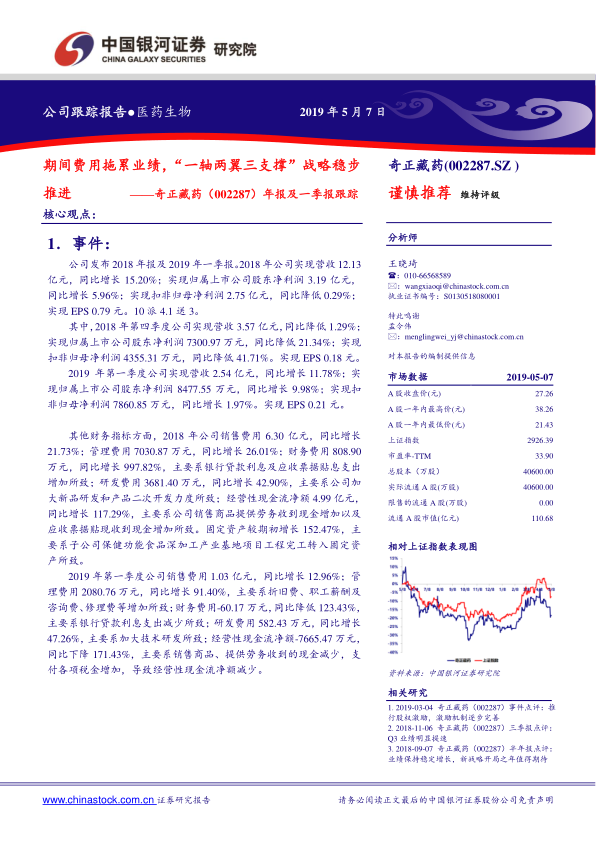 本报告分析了奇正藏药(002287.SZ)2018年年报及2019年一季报,指出公司营收保持稳定增长,但期间费用大幅增加,导致利润增速低于收入增速。