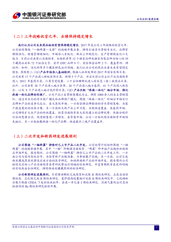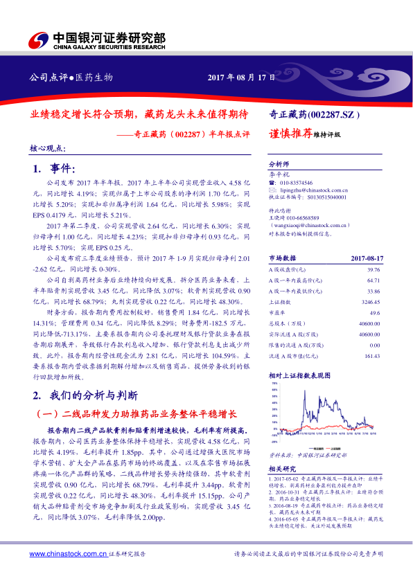 奇正藏药在2017年上半年展现了稳健的财务表现,营业收入和净利润均实现同比增长,符合市场预期。公司通过剥离药材业务,聚焦核心医药板块,并成功推动二线品种(如软膏剂和丸剂)实现高速增长,有效对冲了主打产品贴膏剂面临的市场竞争压力。在战略层面,公司“一轴两翼一支撑”的战略布局持续深化,通过强化市场准入优势(广泛覆盖国家及地方医保、基药目录)和“疼痛一体化”的差异化营销策略,巩固了其在藏药市场的龙头地位。此外,公司在已上市产品的二次开发和多个新药的研发方面均取得积极进展,为未来的产品线拓展和业绩增长提供了有力支撑。尽管存在药品降价、新药研发及新品推广不及预期等风险,但基于其稳健的业绩、清晰的战略、强大的市场准入能力和持续的研发投入,报告维持了对奇正藏药的“谨慎推荐”评级,认为其未来发展潜力值得期待。