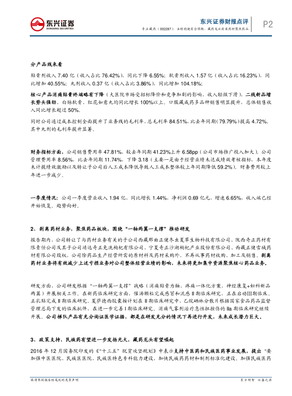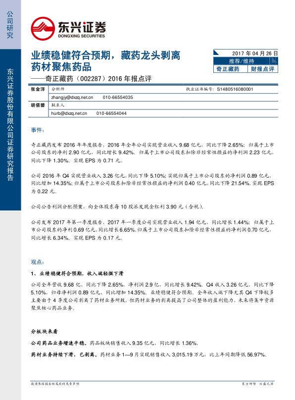 东兴证券发布的奇正藏药(002287)2016年报点评报告指出,公司业绩稳健符合预期,并通过剥离药材业务,聚焦核心药品业务,有望迎来业绩拐点。