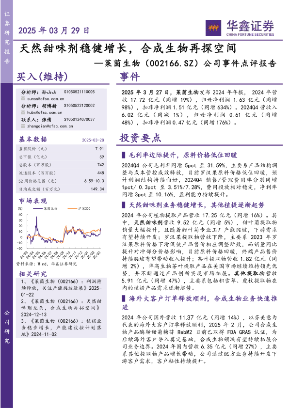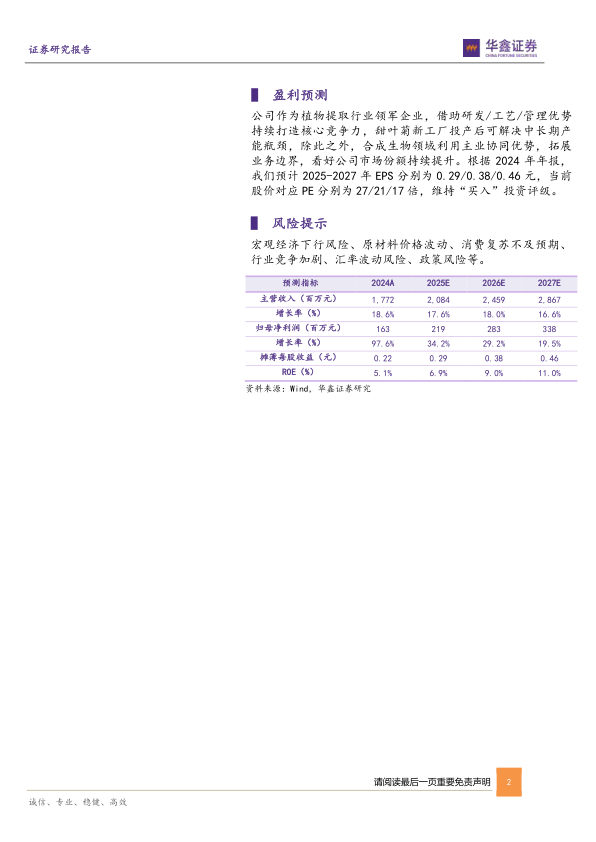 公司作为植物提取行业领军企业,借助研发/工艺/管理优势持续打造核心竞争力,甜叶菊新工厂投产后可解决中长期产能瓶颈,除此之外,合成生物领域利用主业协同优势,拓展业务边界,看好公司市场份额持续提升。根据2024年年报,我们预计2025-2027年EPS分别为0.29/0.38/0.46元,当前股价对应PE分别为27/21/17倍,维持“买入”投资评级。