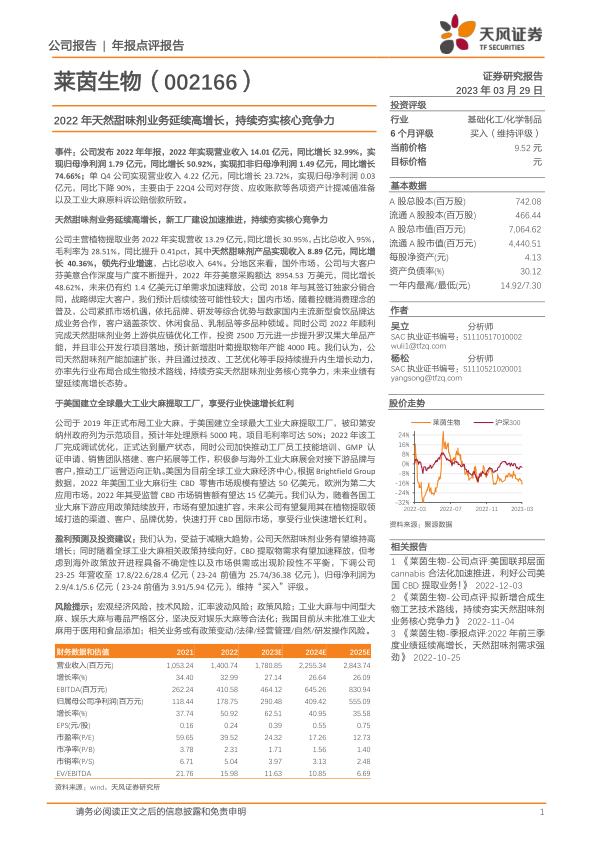 本报告对莱茵生物2022年年报进行了深入分析,指出公司天然甜味剂业务延续高增长态势,并通过产能扩张和技术升级持续夯实核心竞争力。同时,公司在美国建立的工业大麻提取工厂已进入量产状态,有望受益于全球工业大麻市场的发展。报告对公司未来盈利进行了预测,并维持“买入”评级,同时也提示了相关风险。
