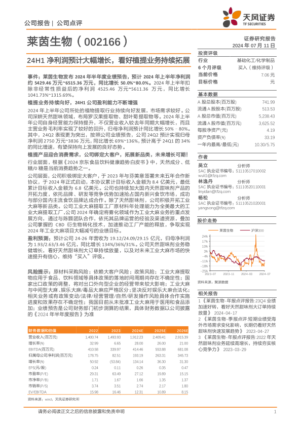 本报告主要分析了莱茵生物(002166)2024年上半年的业绩预告,并对其植提业务的持续拓展前景表示乐观。