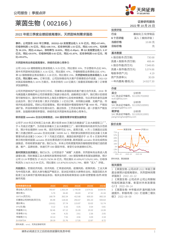 受益于“减糖”大趋势,天然甜味剂业务进入高速增长期;同时美国工业大麻相关政策持续向好,CBD提取物需求有望加速释放。天风证券预计公司2022-2024年营收分别为17.45亿元、25.74亿元和36.38亿元,同比增长65.69%、47.52%和41.34%。归母净利润分别为2.56亿元、3.91亿元和5.94亿元,同比增长115.87%、53.02%和51.74%。基于此,维持“买入”评级。