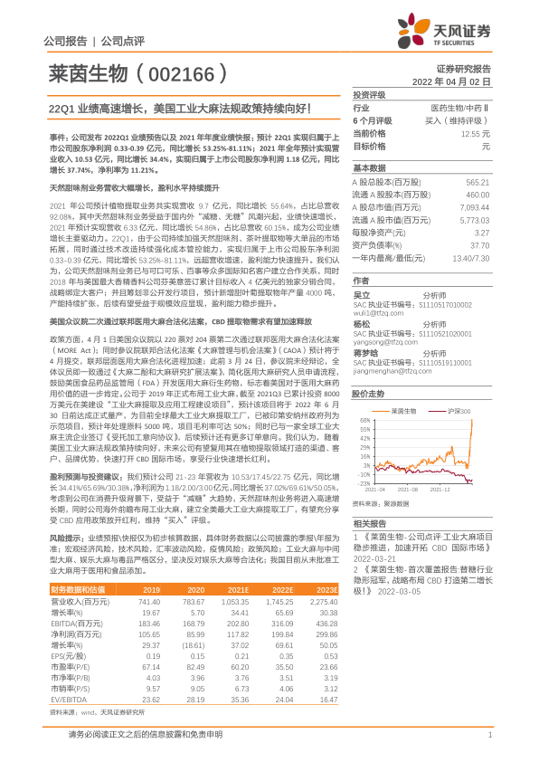 本报告主要分析了莱茵生物(002166)2022年第一季度业绩高速增长的原因,以及美国工业大麻法规政策向好对公司的潜在影响,并维持“买入”评级。