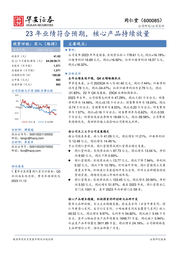 本报告分析了同仁堂2023年的业绩表现,并对其未来发展进行了展望。核心观点如下: