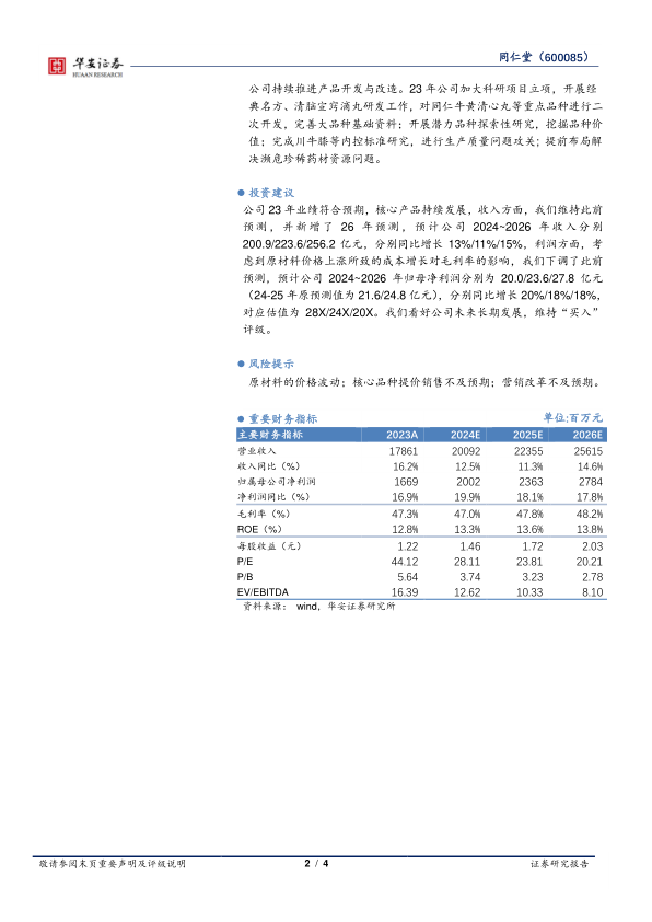 公司23年业绩符合预期,核心产品持续发展,收入方面,我们维持此前预测,并新增了26年预测,预计公司2024~2026年收入分别200.9/223.6/256.2亿元,分别同比增长13%/11%/15%,利润方面,考虑到原材料价格上涨所致的成本增长对毛利率的影响,我们下调了此前预测,预计公司2024~2026年归母净利润分别为20.0/23.6/27.8亿元(24-25年原预测值为21.6/24.8亿元),分别同比增长20%/18%/18%,对应估值为28X/24X/20X。我们看好公司未来长期发展,维持“买入”评级。