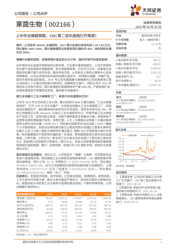 莱茵生物2022年上半年业绩表现亮眼,归母净利润预计实现100%-150%的同比增长,主要得益于其在天然甜味剂市场的稳健增长和工业大麻(CBD)业务的突破性进展。公司在天然甜味剂领域持续巩固其“隐形冠军”地位,通过与国际巨头合作及拓展国内市场实现业务扩张。同时,全球最大工业大麻提取工厂的正式量产,为公司打开了新的增长曲线,有望在全球工业大麻市场快速发展中占据有利地位。分析师上调了公司未来三年的盈利预测,并维持“买入”评级,但同时提示了宏观经济、政策、技术、汇率及产能利用率等多方面风险。
