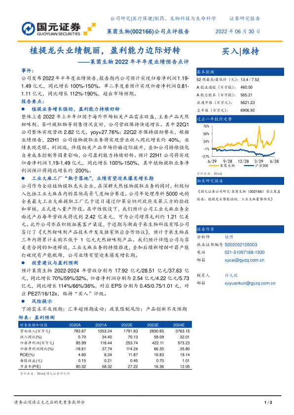 本报告对莱茵生物2022年半年度业绩预告进行了分析,指出公司植提业务增长强劲,盈利能力持续好转。同时,公司在工业大麻领域的布局有望带来业绩的爆发增长。维持对公司“买入”评级,并给出了未来三年的营收和利润预测。