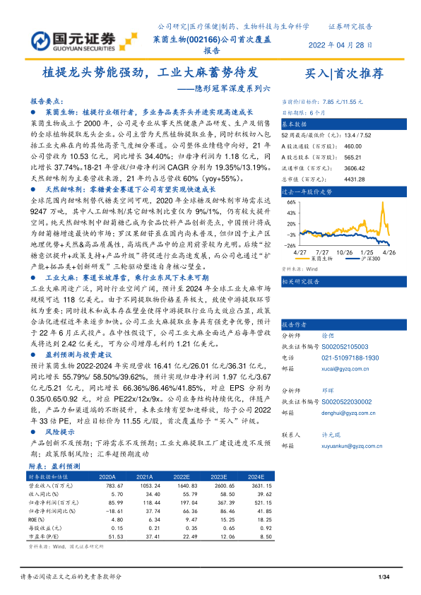 预计莱茵生物2022-2024年实现营收16.41亿元/26.01亿元/36.31亿元,同比增长55.79%/58.50%/39.62%,预计实现归母净利润1.97亿元/3.67亿元/5.21亿元,同比增长66.36%/86.46%/41.85%,对应EPS分别为0.35/0.65/0.92元,对应PE22x/12x/9x。公司业务结构持续优化,伴随产能,产品力和渠道端的不断提升,未来业绩有望加速释放,给予公司2022年33倍PE,对应目标价为11.55元/股,首次覆盖给予“买入”评级。