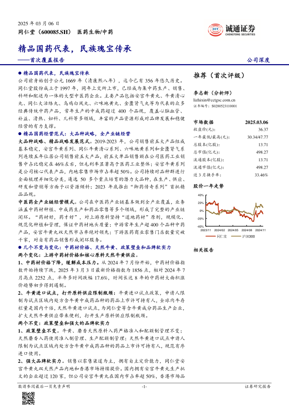 报告指出,同仁堂的投资逻辑在面临上游中药材价格波动时,正迎来关键的“不变与变化”。一方面,中药材价格指数自2024年7月以来持续下跌,初步遏制了长达8年的涨价趋势,预计将有效缓解公司面临的成本压力。另一方面,国家药监局推出的天然牛黄进口试点政策,有望显著拓宽核心原料天然牛黄的供应渠道,解决长期存在的供需矛盾,从而为公司含牛黄成分药品的生产扩张和盈利能力提升提供有力支撑。同时,天然麝香的配额管理和天然牛黄进口的严格准入,构筑了坚实的政策壁垒,结合公司强大的品牌软实力和自主定价能力,共同支撑了其未来的稳健增长和盈利空间。基于对这些因素的综合考量,报告预测同仁堂未来几年营收和净利润将持续增长,并首次覆盖给予“推荐”评级。