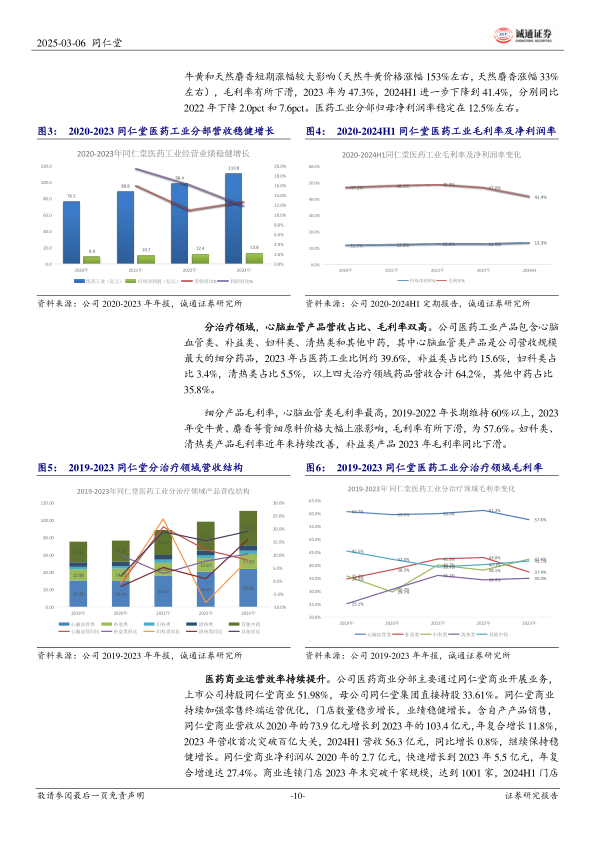 大品种战略、精品战略发展范式。2019-2023年,公司销售前五大产品组成基本稳定,安宫牛黄系列、同仁牛黄清心系列、六味地黄系列和金匮肾气系列连续五年位居公司销售前五大产品,前五大单品销售额在公司医药工业销售中占比稳定在46%左右,但毛利率显著高于医药工业整体;安宫牛黄系列是公司核心代表产品,内地零售市场市占率超50%。公司持续对品种群进行全面梳理并细化分类,遴选50多个重点培育的潜力大品种,在生产、供应、研发和营销等方面予以资源倾斜;2023年底推出“御药传奇系列”首批精品品规。