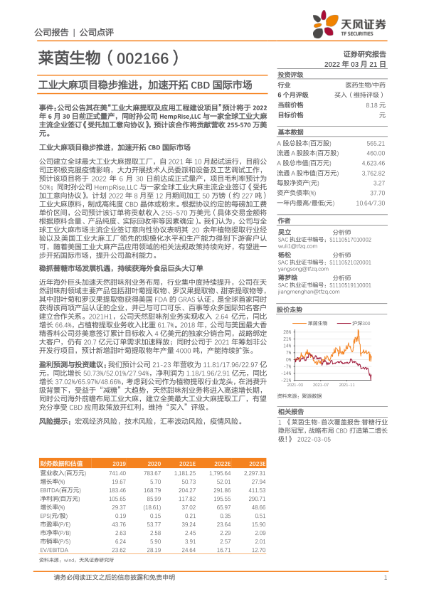 盈利预测与投资建议:我们预计公司21-23年营收为11.81/17.96/22.97亿元,同比增长50.73%/52.01%/27.94%,净利润为1.18/1.96/2.91亿元,同比增长37.02%/65.97%/48.66%,考虑到公司作为植物提取行业龙头,在消费升级背景下,受益于“减糖”大趋势,天然甜味剂业务将进入高速增长期,同时公司海外前瞻布局工业大麻,建立全美最大工业大麻提取工厂,有望充分享受CBD应用政策放开红利,维持“买入”评级。