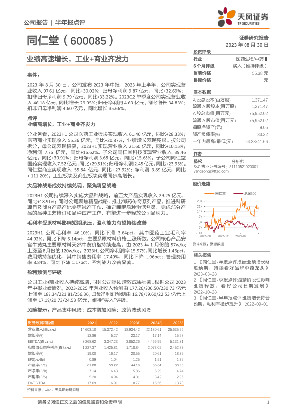 同仁堂2023年中报显示公司业绩高速增长,工业和商业板块齐发力,大品种战略和精品战略成效显著。虽然毛利率短期受原材料价格影响承压,但费用端优化带来盈利能力改善。天风证券上调了公司盈利预测,并维持“买入”评级。投资者应关注产品集中、成本增加和政策波动等风险。