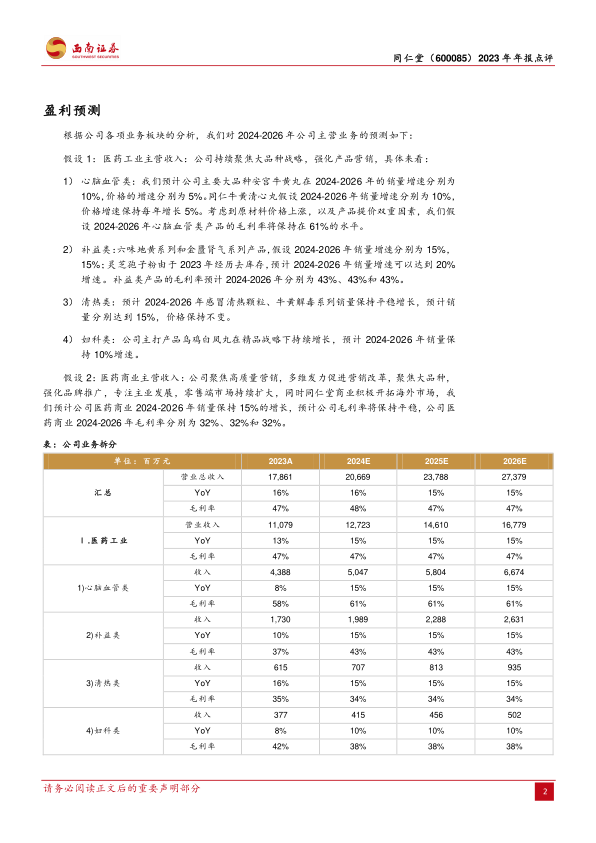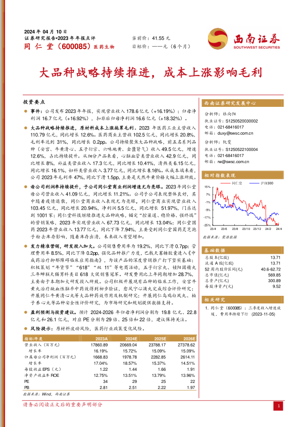 大品种战略持续推进,原材料成本上涨拖累毛利。2023年医药工业主营收入110.79亿元,同比增长12.6%。医药商业主营收102.5亿元,同比增长20.8%,毛利率达到31%,同比增长0.2pp。公司持续聚焦大品种战略,前五名系列品种(安宫、牛黄清心、五子衍宗、六味地黄、金匮肾气)收入49.5亿元,增速12.6%,占比持续提升。从细分产品来看,心脑血管类营业收入42.9亿元,同比增长8%,补益类营业收入17.3亿元,同比增长10.41%,清热类6.15亿元,同比增长16.1%,妇科类营业收入3.77亿元,同比增长8.16%。从成本端来看,公司2023年毛利率47%,同比下滑1.5pp,主要是天然牛黄价格大幅上涨所致。