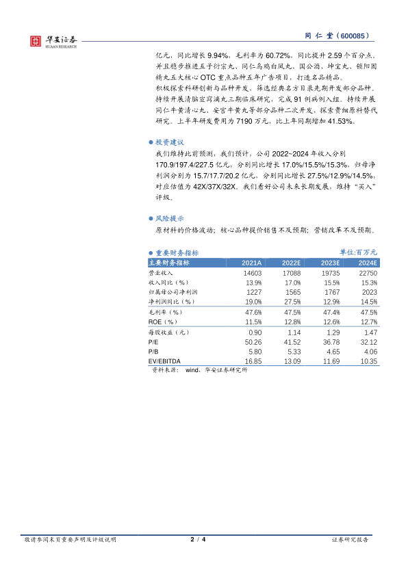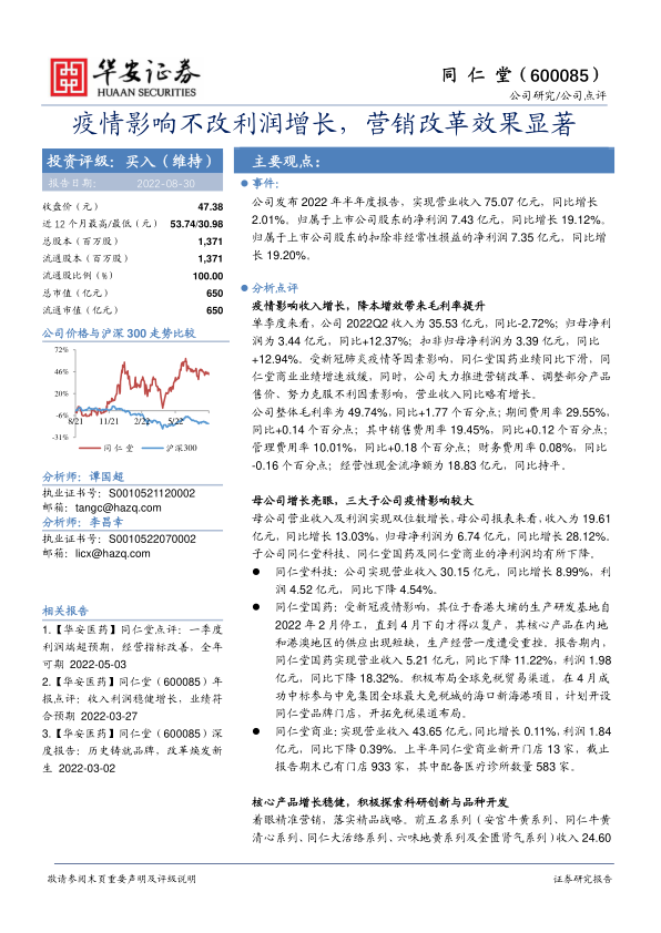 本报告对同仁堂2022年半年度报告进行了深入分析,指出公司在疫情影响下通过营销改革和成本控制实现了利润增长。母公司业绩表现亮眼,但子公司受到疫情不同程度的影响。公司核心产品增长稳健,并积极进行科研创新。报告维持对同仁堂的“买入”评级,但同时也提示了原材料价格波动、核心品种销售和营销改革不及预期的风险。