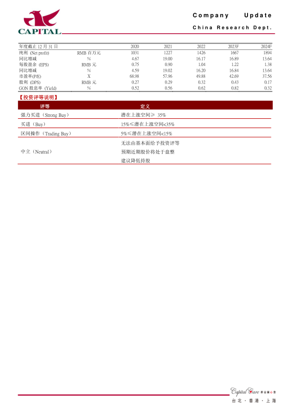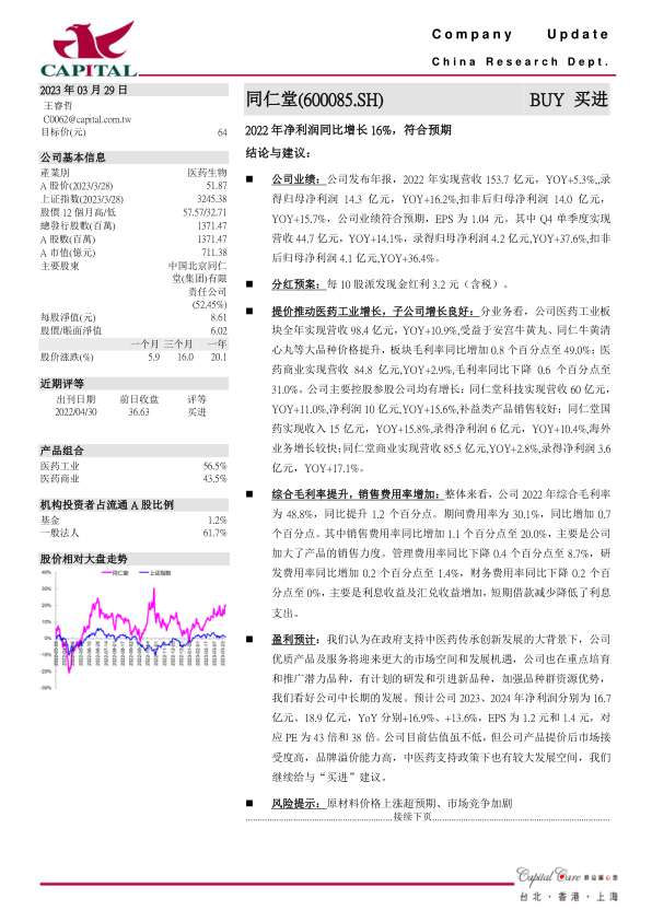 盈利预计:我们认为在政府支持中医药传承创新发展的大背景下,公司优质产品及服务将迎来更大的市场空间和发展机遇,公司也在重点培育和推广潜力品种,有计划的研发和引进新品种,加强品种群资源优势,我们看好公司中长期的发展。预计公司2023、2024年净利润分别为16.7亿元、18.9亿元,YoY分别+16.9%、+13.6%,EPS为1.2元和1.4元,对应PE为43倍和38倍。公司目前估值虽不低,但公司产品提价后市场接受度高,品牌溢价能力高,中医药支持政策下也有较大发展空间,我们继续给与“买进”建议。