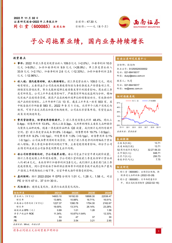 本报告分析了同仁堂2022年三季报,指出公司在疫情影响下,国内业务仍保持增长,费用管控得当,盈利能力有所提升。但子公司业绩波动对整体业绩产生一定拖累。预计未来几年公司盈利将保持增长,但需关注疫情和政策带来的不确定性。