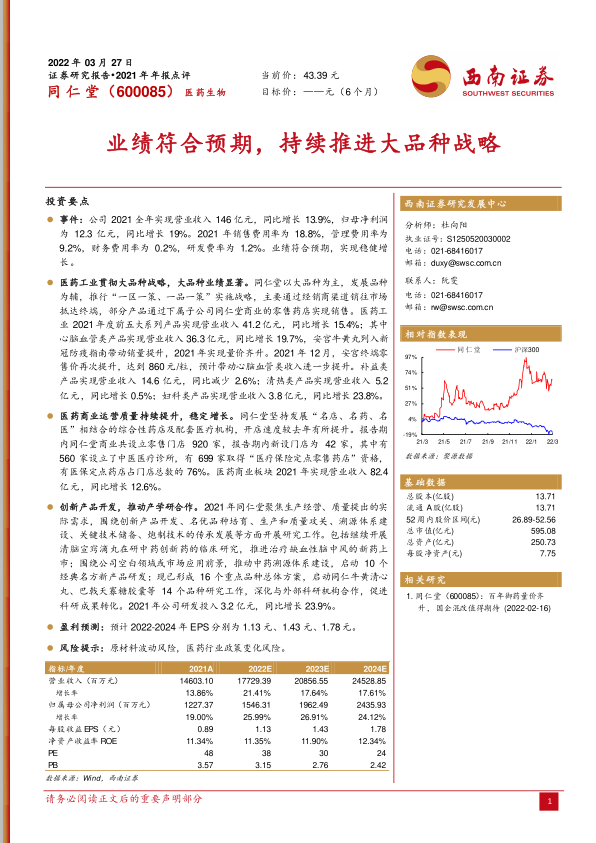 同仁堂2021年业绩表现符合预期,营业收入和归母净利润均实现稳健增长,这主要得益于公司在医药工业领域成功推行的大品种战略,以及医药商业板块运营质量的持续提升。公司通过精细化管理和市场策略,有效巩固了市场地位。