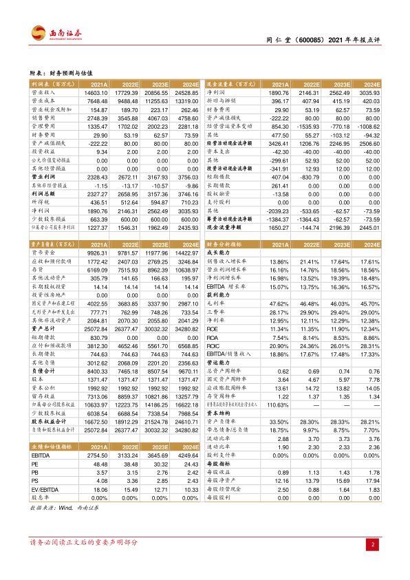 西南证券研究发展中心对同仁堂的未来盈利能力持乐观态度,预计公司2022-2024年的每股收益(EPS)将分别为1.13元、1.43元和1.78元,呈现持续增长趋势。预计2022-2024年营业收入将分别达到177.29亿元、208.57亿元和245.29亿元,增长率分别为21.41%、17.64%和17.61%。归属母公司净利润预计分别为15.46亿元、19.62亿元和24.36亿元,增长率分别为25.99%、26.91%和24.12%,净利润增速高于营收增速,显示盈利能力提升。净资产收益率(ROE)预计将从2021年的11.34%稳步提升至2024年的12.34%。随着盈利的增长,市盈率(PE)预计将从2021年的48倍逐步下降至2024年的24倍,市净率(PB)也将从3.57下降至2.42,显示出随着业绩增长,估值吸引力将逐步显现。报告同时提示了原材料波动风险和医药行业政策变化风险,这些是公司未来发展中需要关注的潜在不确定因素。