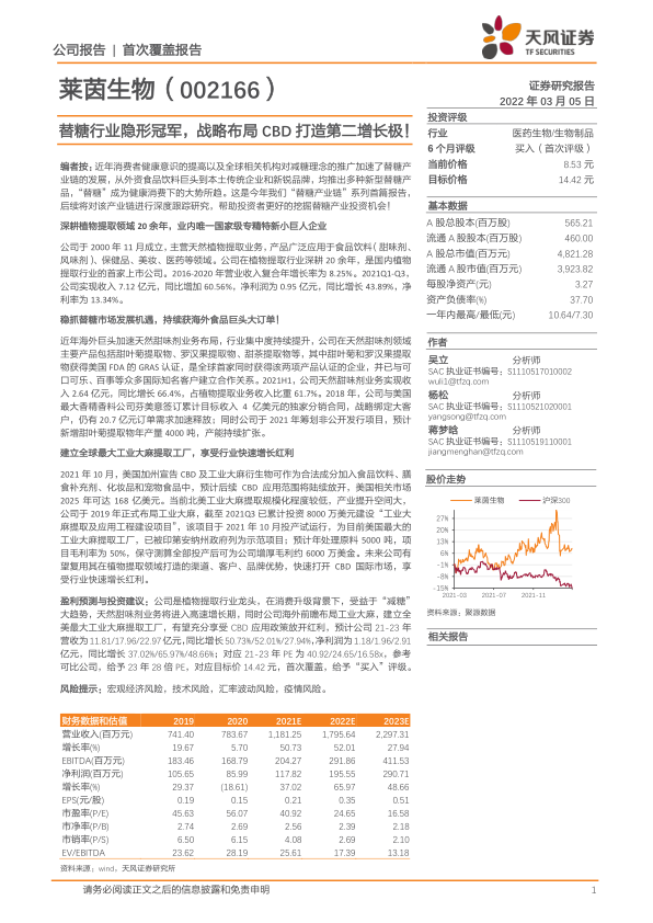 盈利预测与投资建议: 公司是植物提取行业龙头,在消费升级背景下,受益于“ 减糖”大趋势,天然甜味剂业务将进入高速增长期,同时公司海外前瞻布局工业大麻, 建立全美最大工业大麻提取工厂, 有望充分享受 CBD 应用政策放开红利,预计公司 21-23 年营收为 11.81/17.96/22.97亿元,同比增长 50.73%/52.01%/27.94%,净利润为 1.18/1.96/2.91亿元,同比增长 37.02%/65.97%/48.66%;对应 21-23 年 PE 为 40.92/24.65/16.58x,参考可比公司, 给予 23 年 28 倍 PE,对应目标价 14.42 元,首次覆盖, 给予“买入”评级。