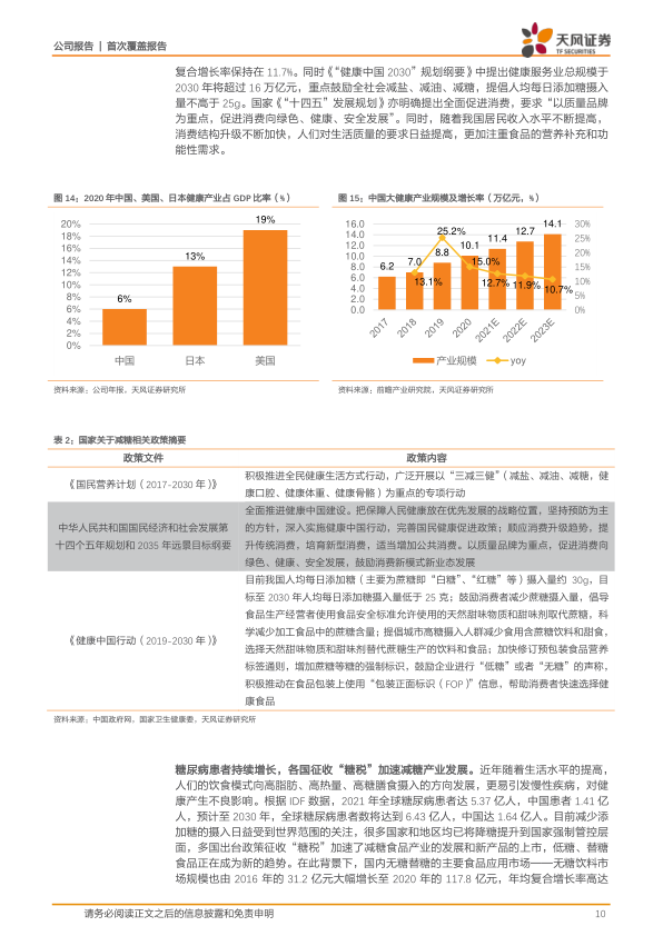 全球健康概念持续升温,国家政策大力支持“减糖”理念。2020年,中国大健康产业规模达10.1万亿元,同比增长15%,占GDP比重约6%,与美国(19%)、日本(13%)相比仍有巨大增长空间,预计2020-2023年复合增长率保持在11.7%。《“健康中国2030”规划纲要》和“十四五”发展规划均明确提出减盐、减油、减糖,倡导人均每日添加糖摄入量不高于25g,并鼓励使用天然甜味物质和甜味剂替代蔗糖。