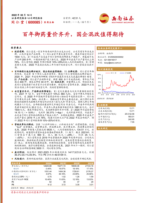 百年御药打造品牌护城河,国企混改值得期待:1)品牌优势:同仁堂百年御药传承,先后有9个项目入选非遗项目,铸造了同仁堂稳固的品牌护城河,2020年、2021年连续两年蝉联《胡润中国最具历史文化底蕴品牌榜》榜首。2)产品优势:同仁堂产品矩阵丰富,拥有800余个中成药品规,常年生产的超过400种,独家品种有40余种。3)混改优势:新董事长上任,邸淑兵先生在同仁堂集团旗下的多家子公司曾任要职,精通同仁堂各项业务。2022年正值国企混改三年行动计划收官之年,混改有望持续推进。